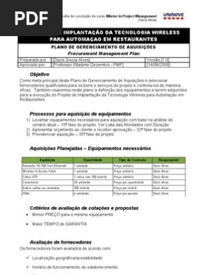 Projeto de implantação da tecnologia wireless para automaçao em restaurantes plano de gerenciamento de aquisições procurement management plan preparado por davis souza alves versão 10 aprovado por professor wladimir dezembro pmp 14082009.