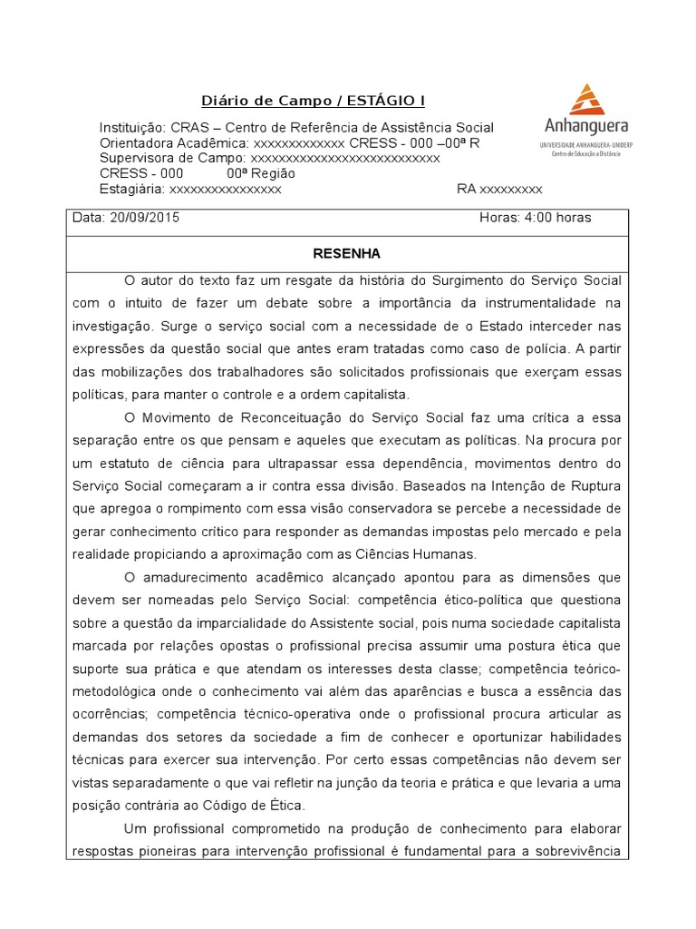 Assim, as informações que podemos compartilhar sobre exemplo de diario de campo de estagio serviço social. Obrigado por visitar o blog Novo Exemplo 05 January 2019.