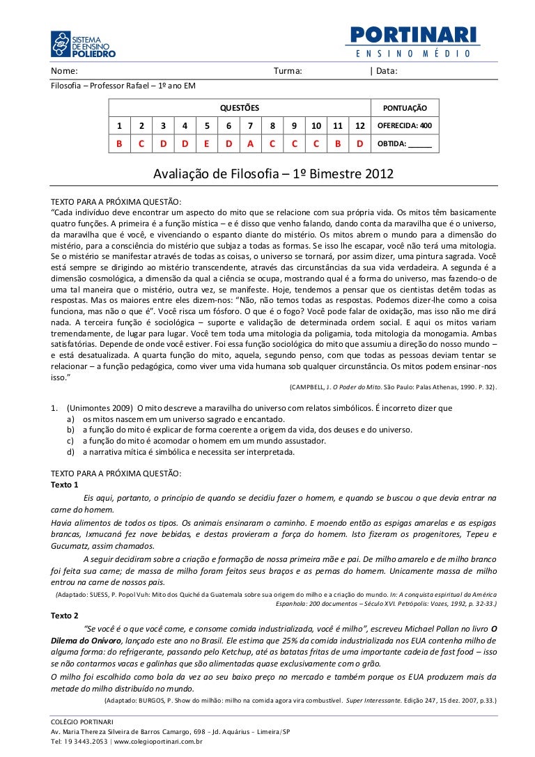 Avaliacao Filosofia 1o Bimestre 1oano 2012