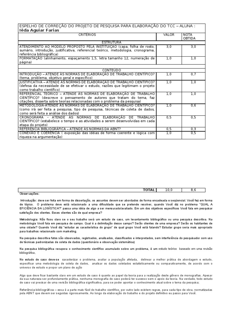 Espelho De Correcao Pre Projeto Adm Ciencia Ciencia Filosofica