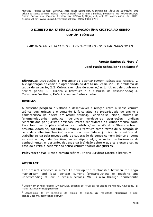 Pdf O Direito Na Tabua Da Salvacao Uma Critica Ao Senso Comum