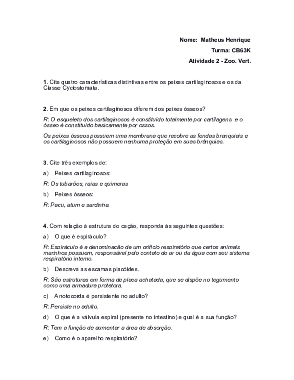 Exercicios Para A Prova De Biologia Sobre Cordados Docsity