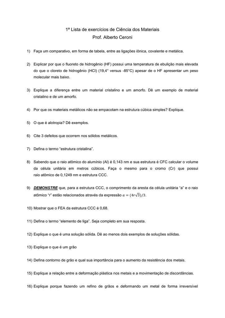 1ª Lista De Exercicios De Ciencia Dos Materiais Prof Alberto Ceroni