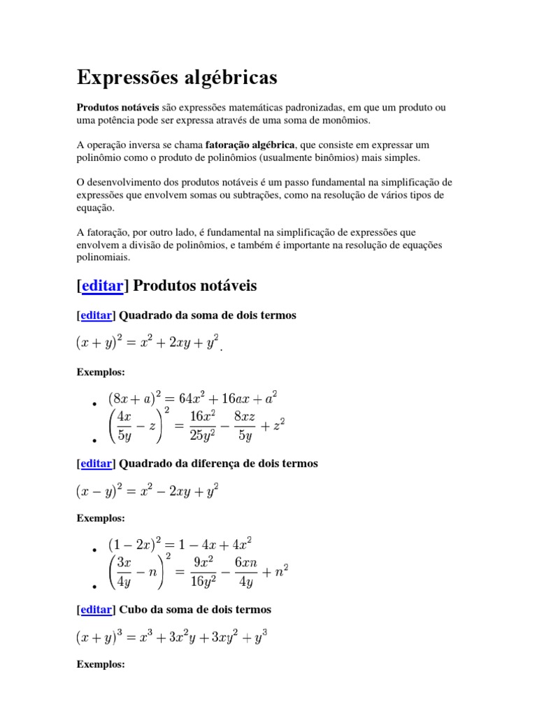 Produtos Notaveis Com Dois Termos Exemplo Matematica Basica