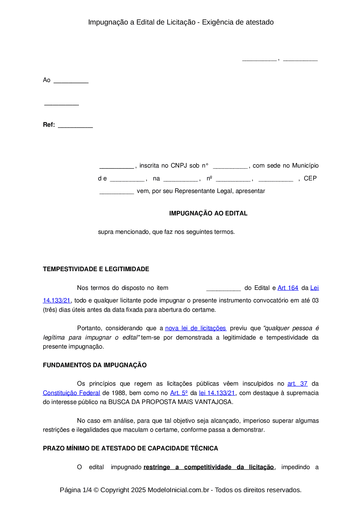 Modelo Impugnacao A Edital De Licitacao Exigencia De Atestado