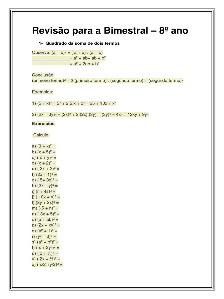 Matematica Quadrado Da Soma De Dois Termos Exercicios Youtube