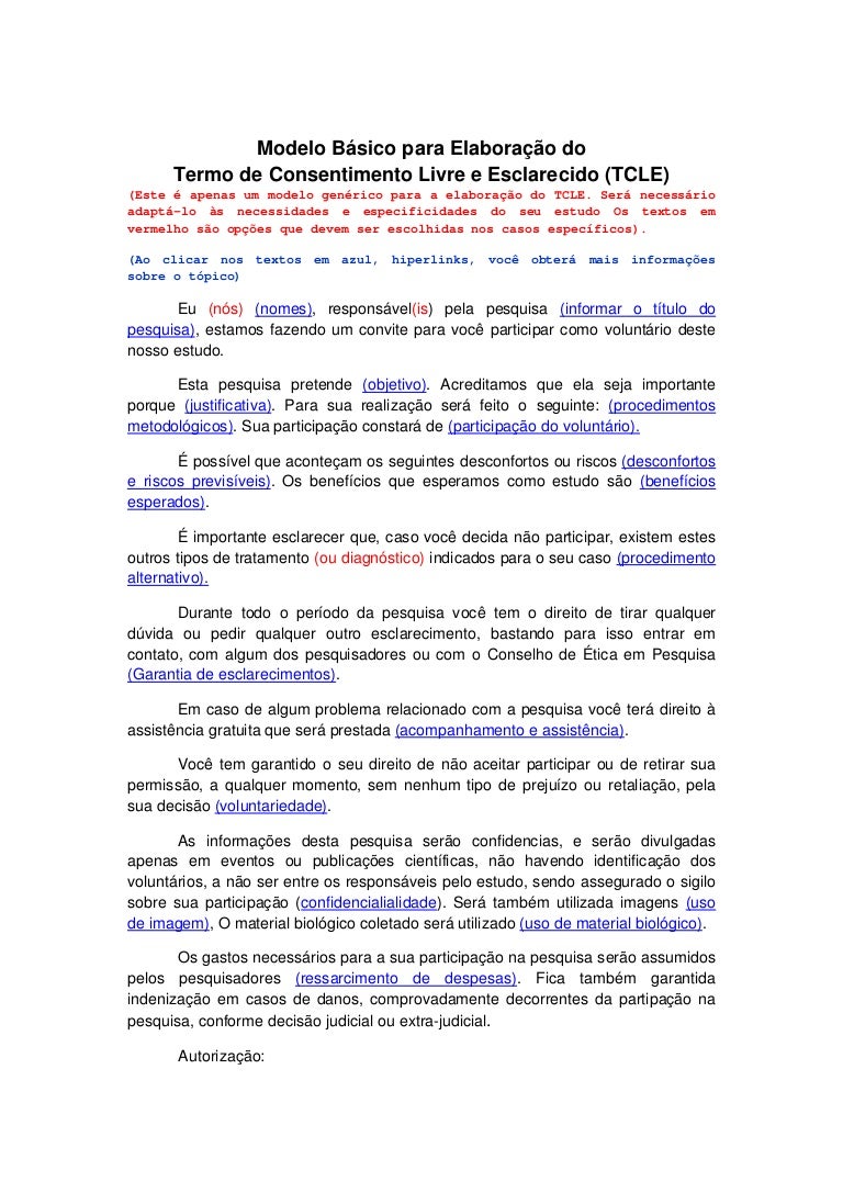 Termo de consentimento livre e esclarecido tcle modelo sugerido antes de redigir o tcle faz se necessário uma leitura cuidadosa da resolução cns 46612 iv que dispõe sobre a elaboração do documento em questão.