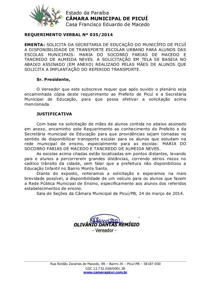 Requerimento Verbal 035 2014 Olivanio Transporte Escolar