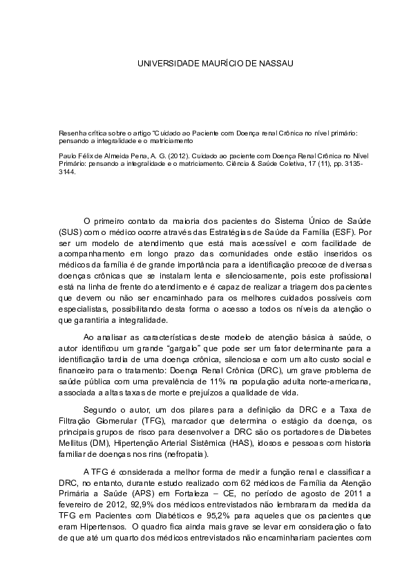 Doc Resenha Critica Cuidado Ao Paciente Com Deonca Renal
