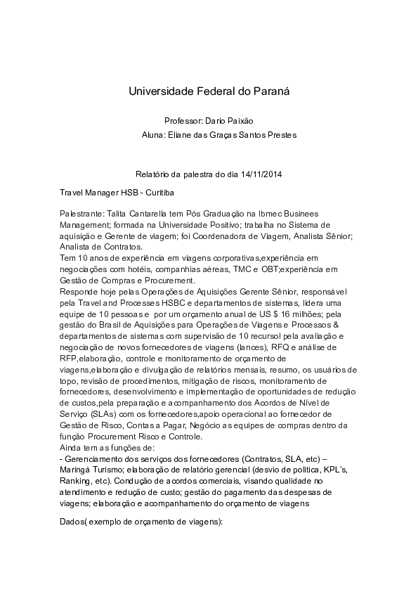 Doc Travel Manager Hsbc Relatorio Dario Pronto Turismo Ufpr