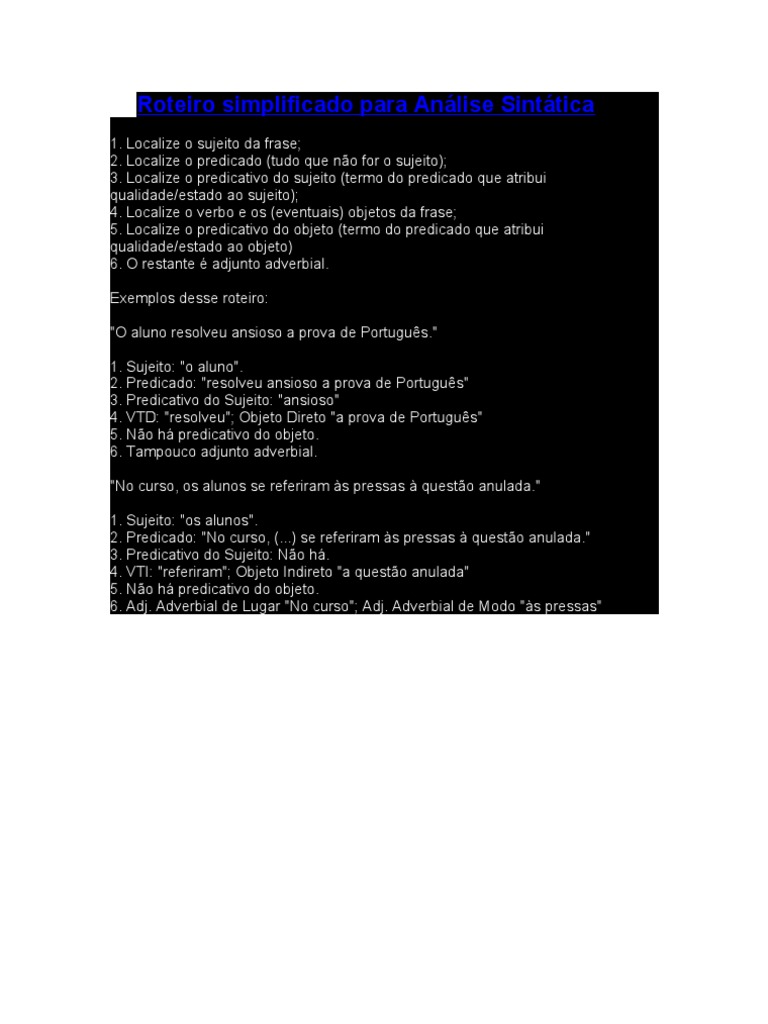 Roteiro Simplificado Para Analise Sintatica Predicado Gramatica