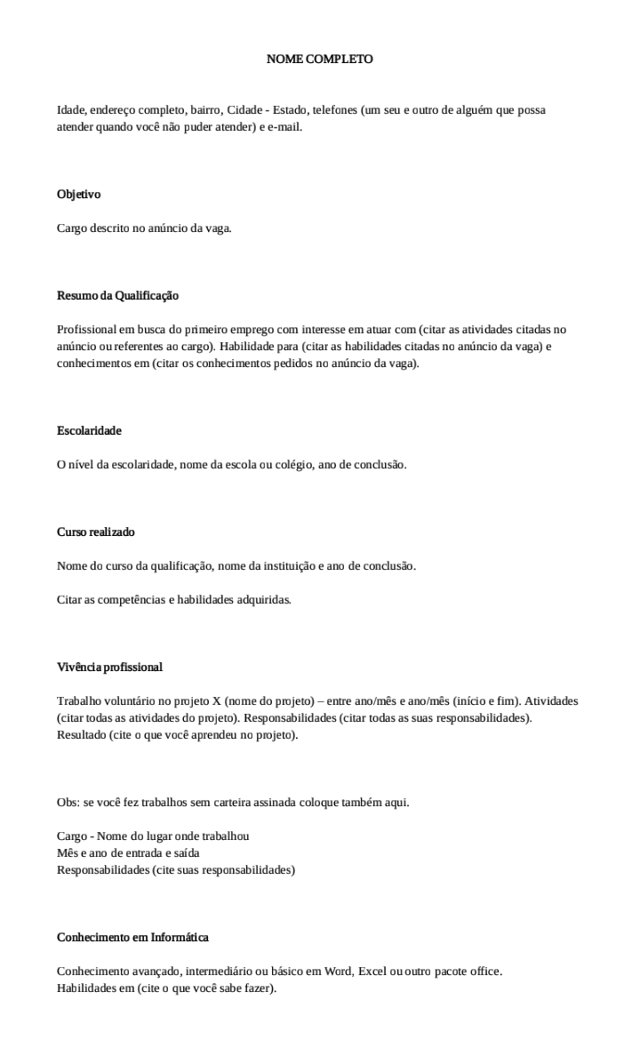 Exemplo De Curriculo Para Primeiro Emprego