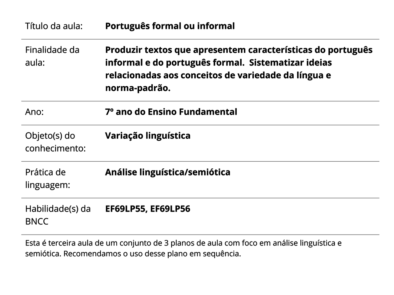 Plano De Aula 7º Ano Lingua Portuguesa Portugues Formal Ou