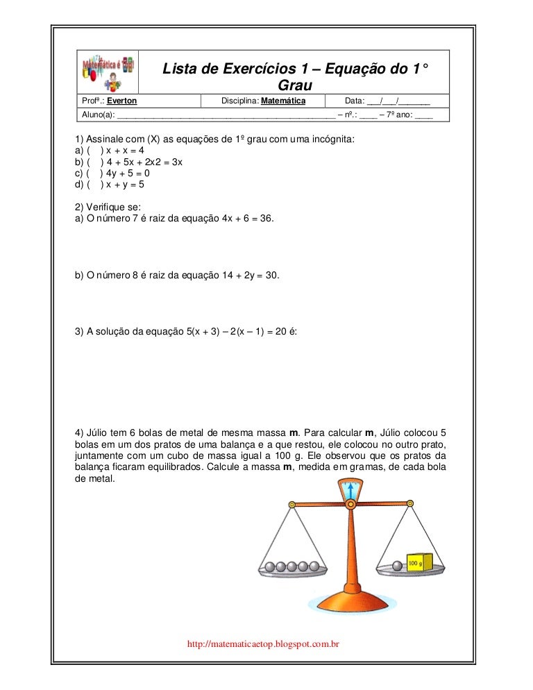 Exercicios Sobre Equacao Do 1º Grau Com Uma Incognita