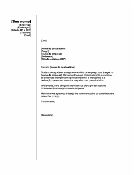 Modelo de carta de recusa de oferta de emprego carta pela qual o profissional recusa de modo cortês uma oferta de emprego para permanecer no trabalho atual.
