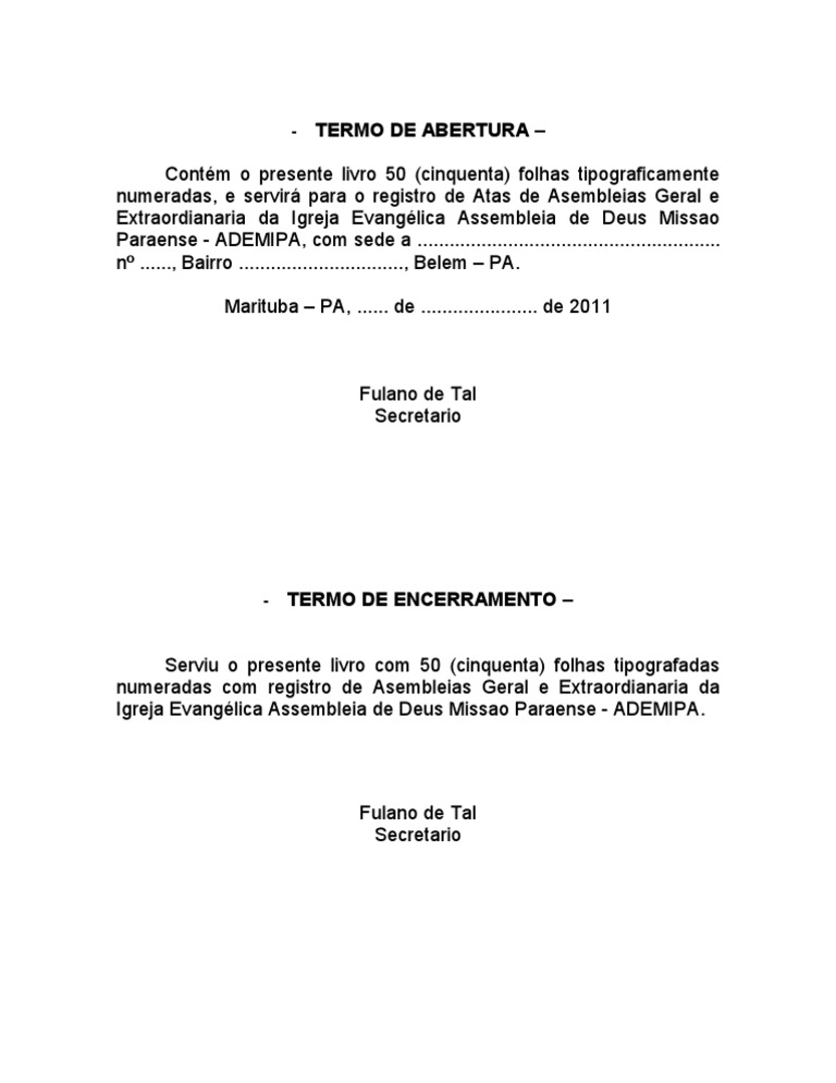 Termos Abertura Livros Atas Fes Religiosas Organizacoes Religiosas