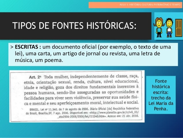 Fonte histórica é tudo aquilo que é usado para reconstruir fatos do passado podendo ser fontes visuais pinturas gravuras filmes materiais vestígios de civilizações passadas como martelos facas artesanais e esculturas escritas através de mapas e documentos utilizados no passado e fonte oral na qual o historiador pode se basear através de relatos de pessoas mais velhas.