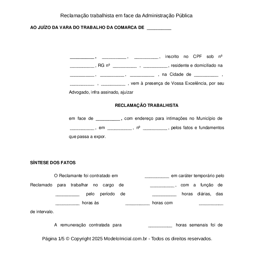 Modelo Reclamacao Trabalhista Em Face Da Administracao Publica