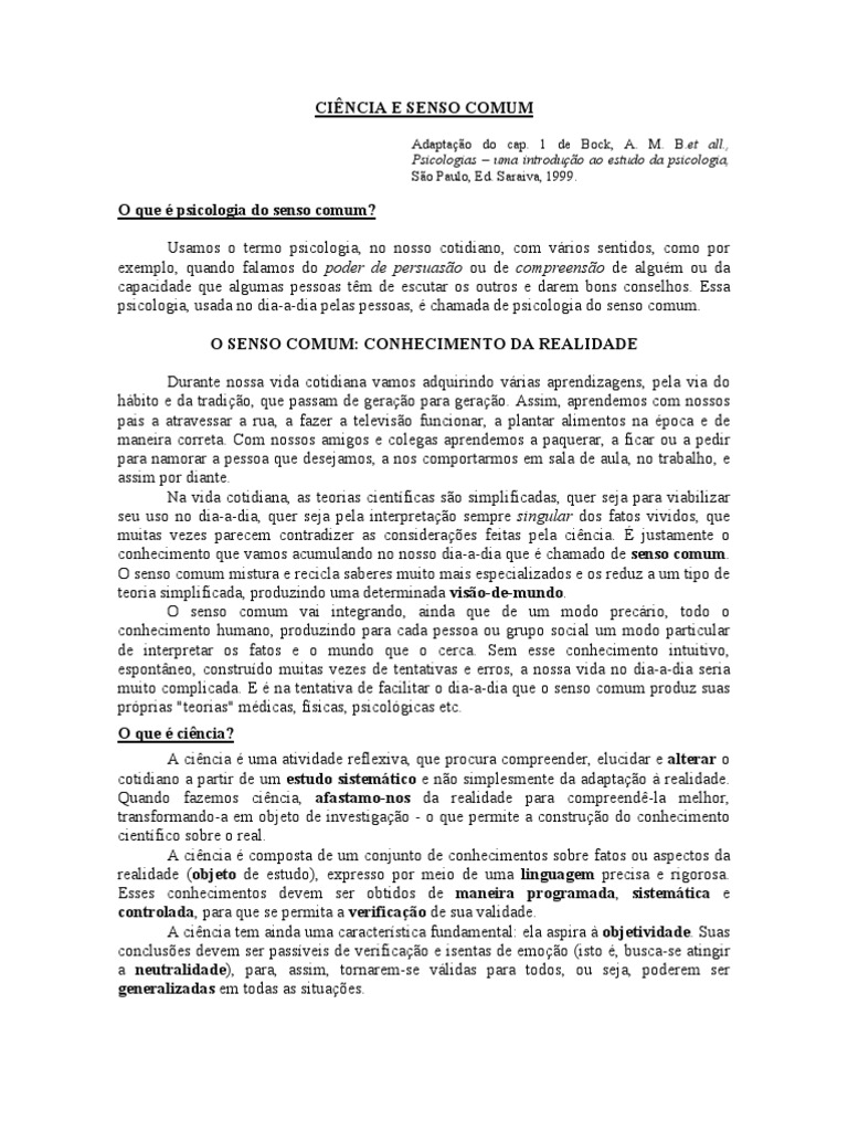 1 Ciencia E Senso Comum Ana Bock 2 Psicologia E Ciencia