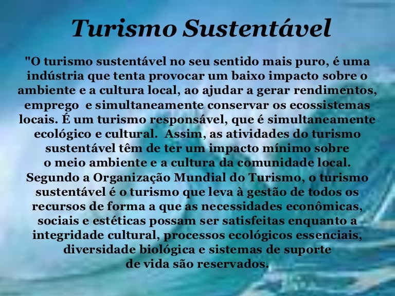 O turismo sustentável foi definido pela primeira vez durante a conferência das nações unidas sobre o meio ambiente e o desenvolvimento eco 92 que aconteceu no rio de janeiro em 1992.