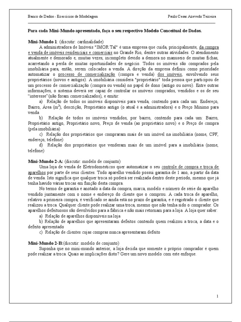 Banco de dados exercícios de modelagem paulo cesar azevedo teixeira para cada mini mundo apresentado faça o seu respectivo modelo conceitual de dados.