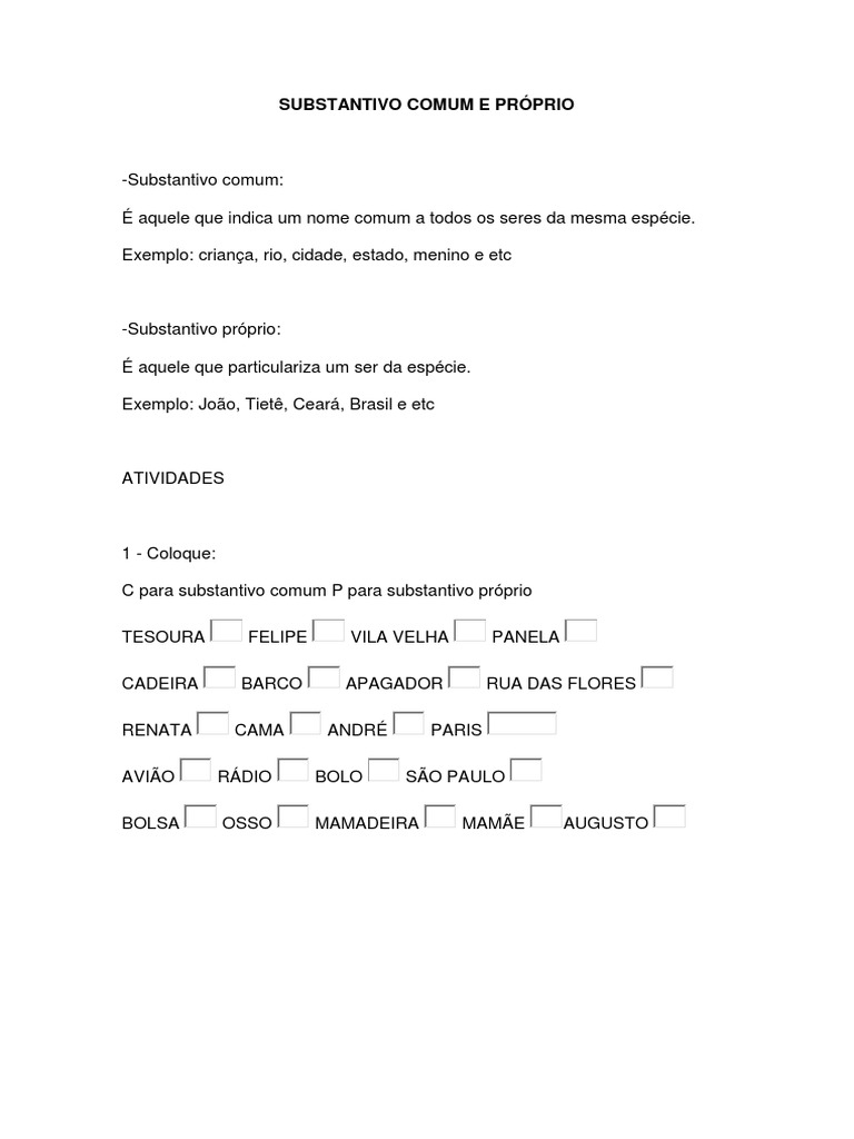 Substantivos próprios e comuns. Cidade país menino mulher criança.