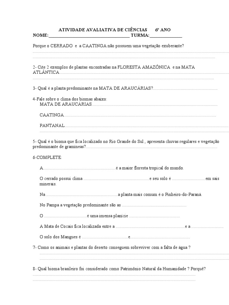 Atividade Avaliativa De Ciencias 6º Ano Biomas Brasileiros