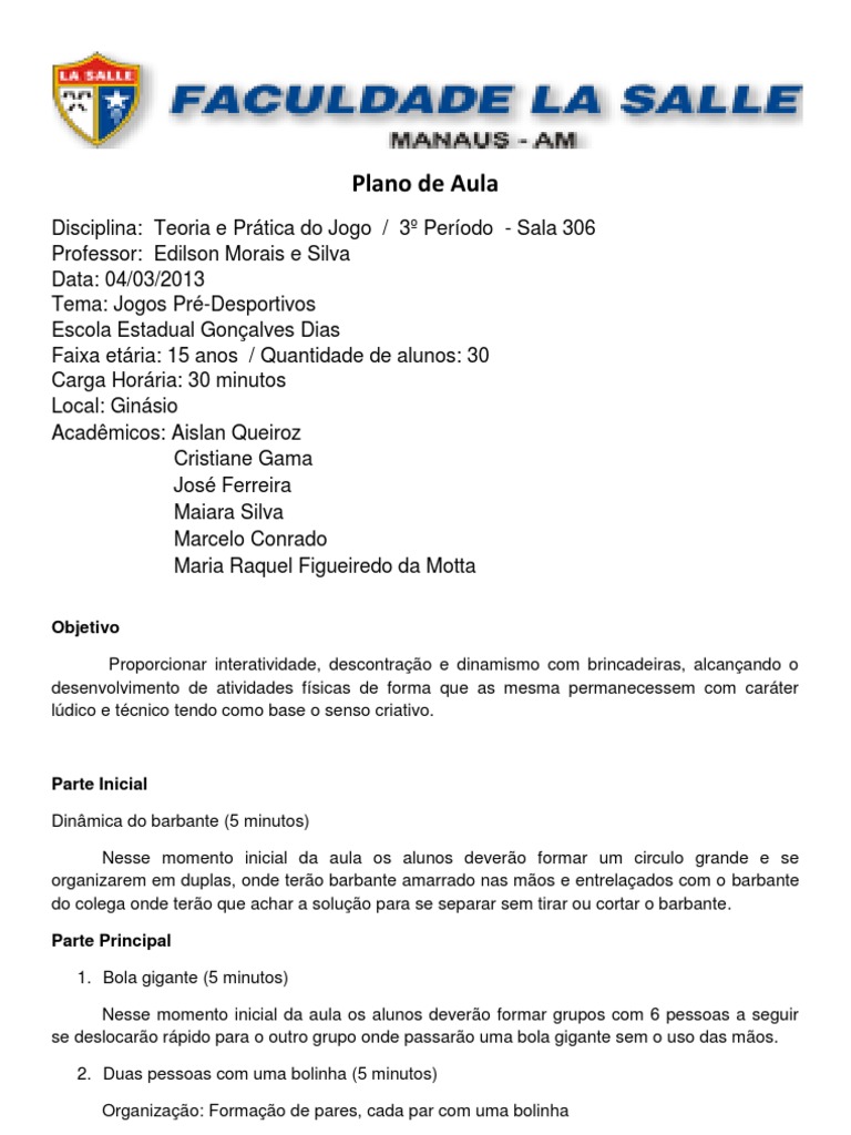 Plano De Aula Jogos Pre Desportivos Educacao Fisica E Educ