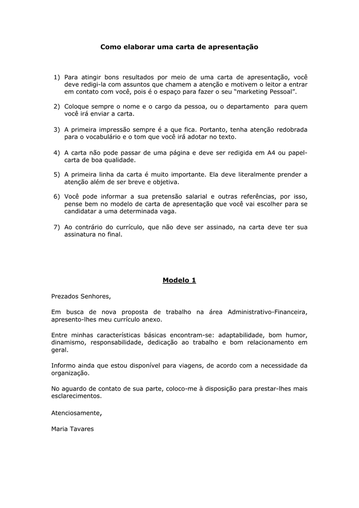 Cada modelo de carta de apresentação mostra como deve ser a estrutura do documento.