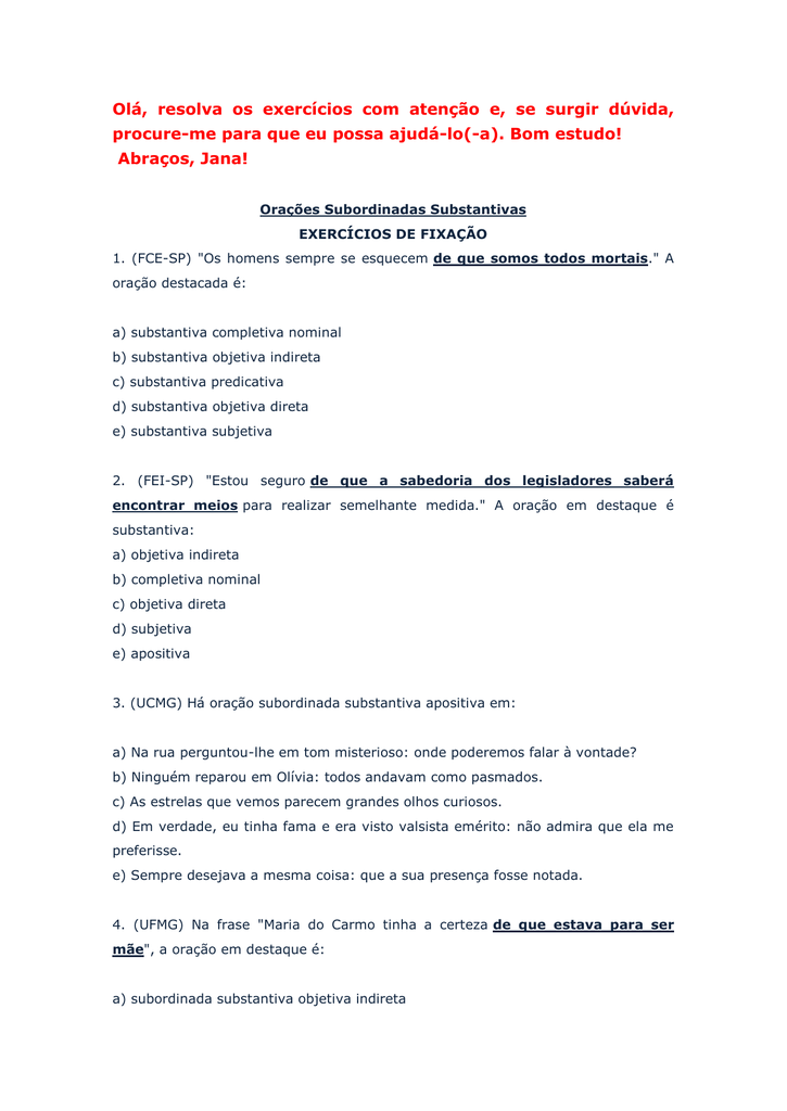 Exercicios De Oracoes Subordinadas Substantivas Gabarito