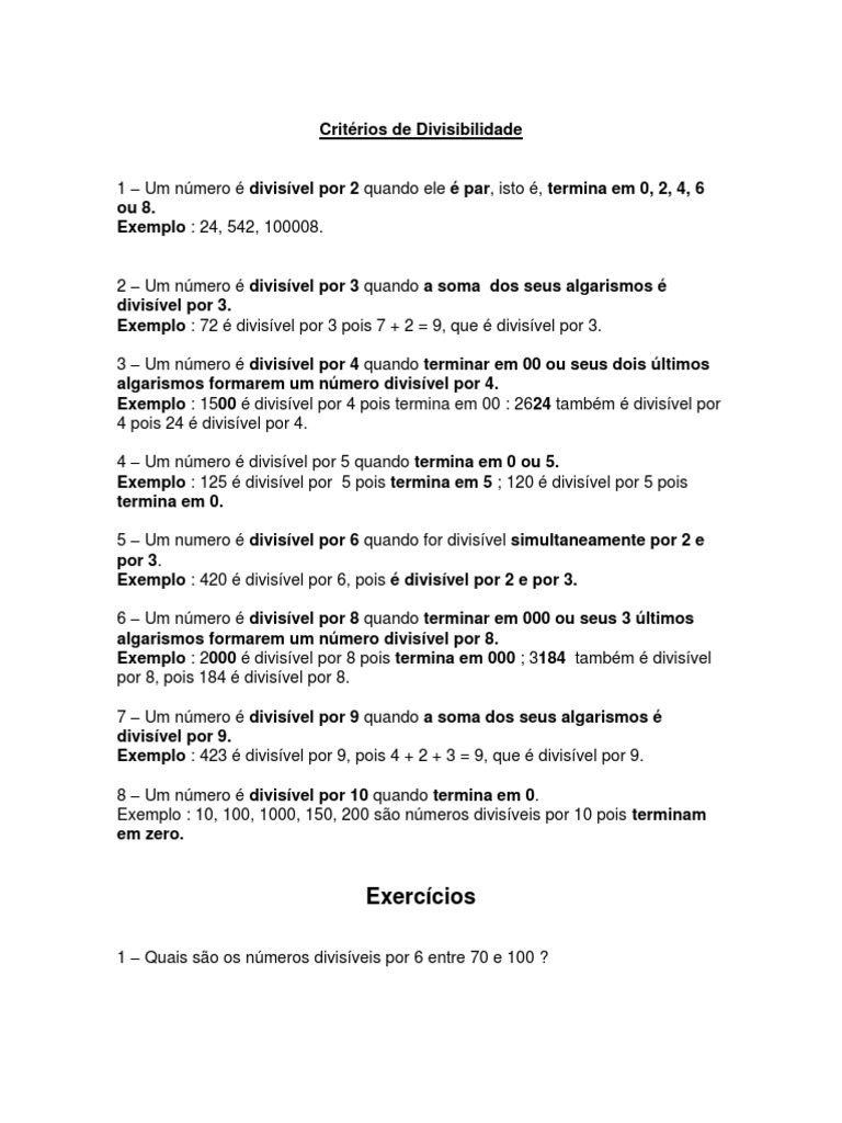 Alguns Criterios De Divisibilidade Por 2 3 4 5 6 7 8 9