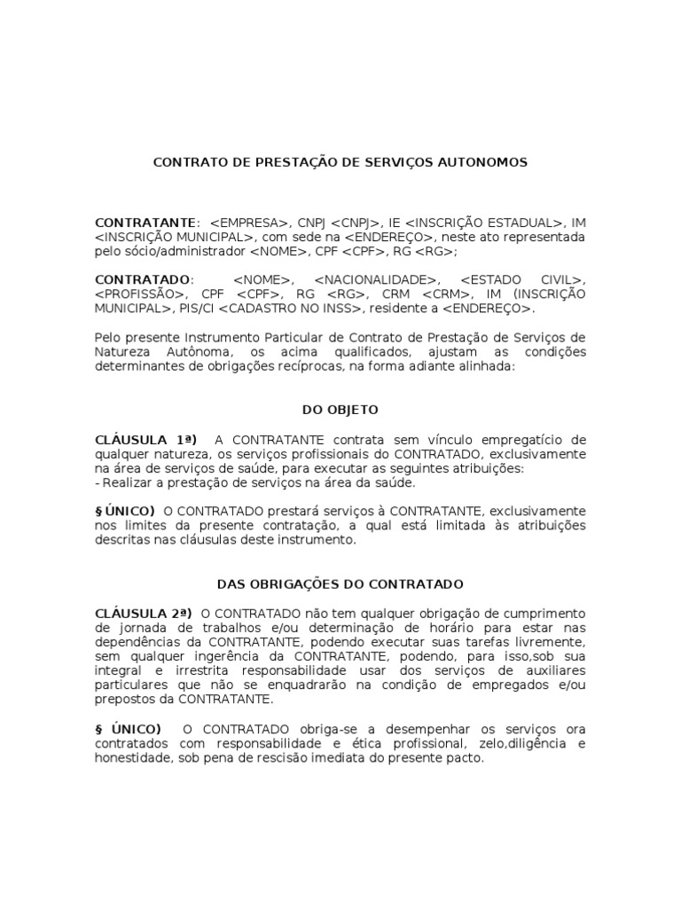 Modelo De Contrato De Prestacao De Servicos De Profissional Autonomo