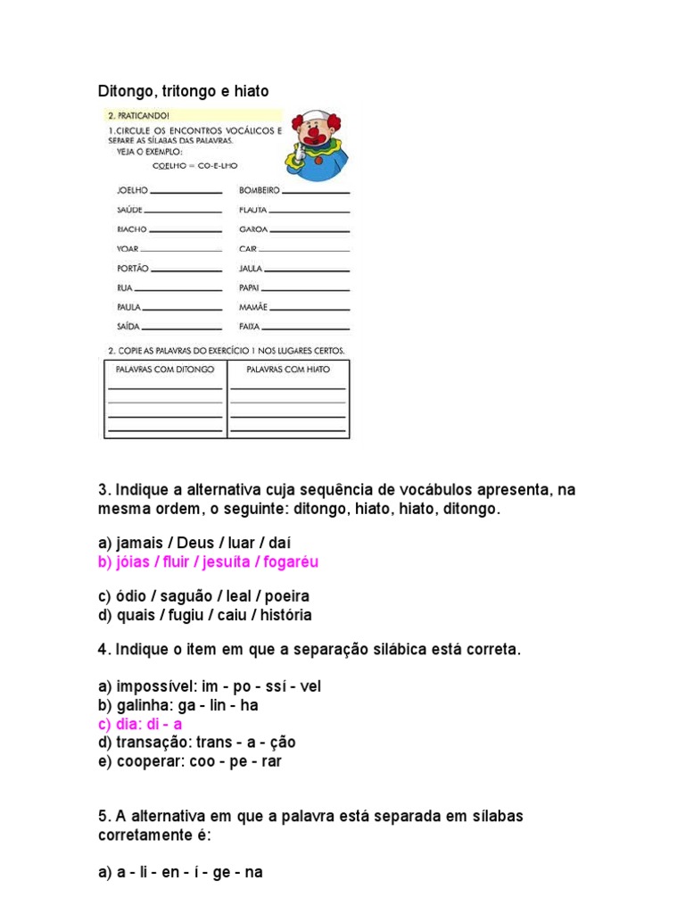 Atividades de ditongo tritongo e hiato atividades de ditongo tritongo e hiato para o 3 ano 4 ano e 5 ano do ensino fundamental para imprimir.