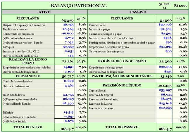 Obtenha de forma simplificada os valores totais dos ativos e passivos detalhados inclusive em circulantes não circulantes permanentes etc além do seu patrimônio líquido.