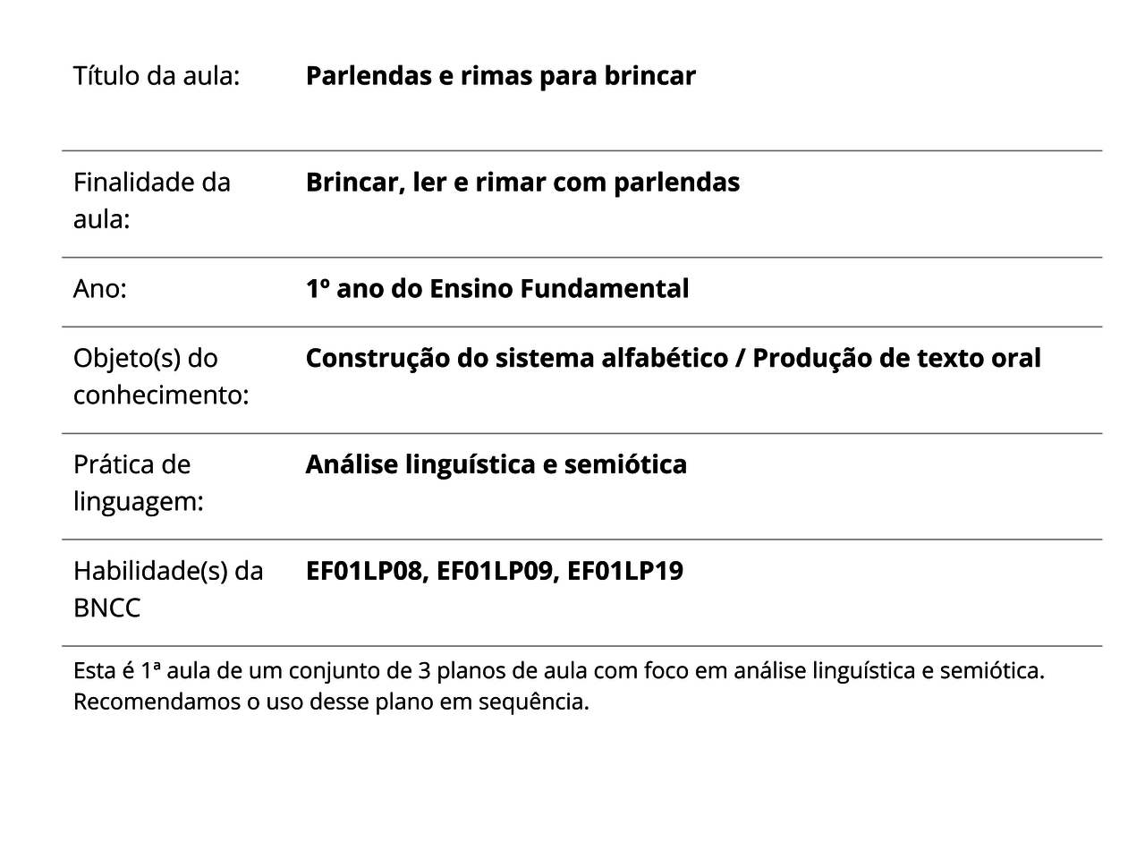 Plano De Aula 1º Ano Lingua Portuguesa Parlendas E Rimas