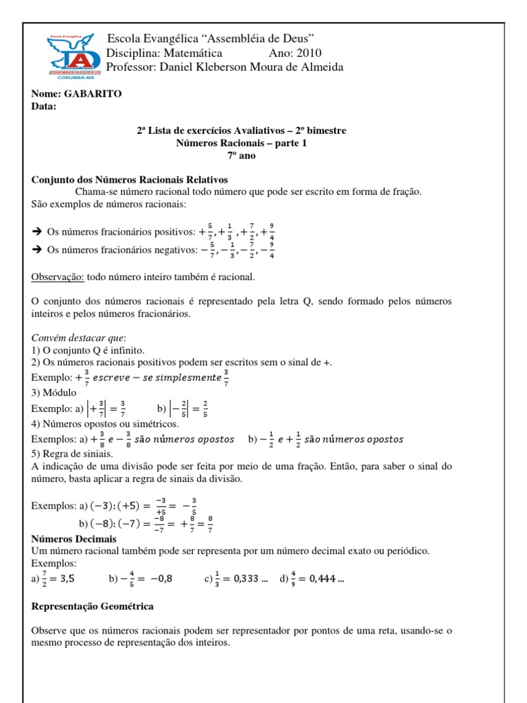 Naºmeros Racionais Parte 1 Gabarito Numero Racional Numeros