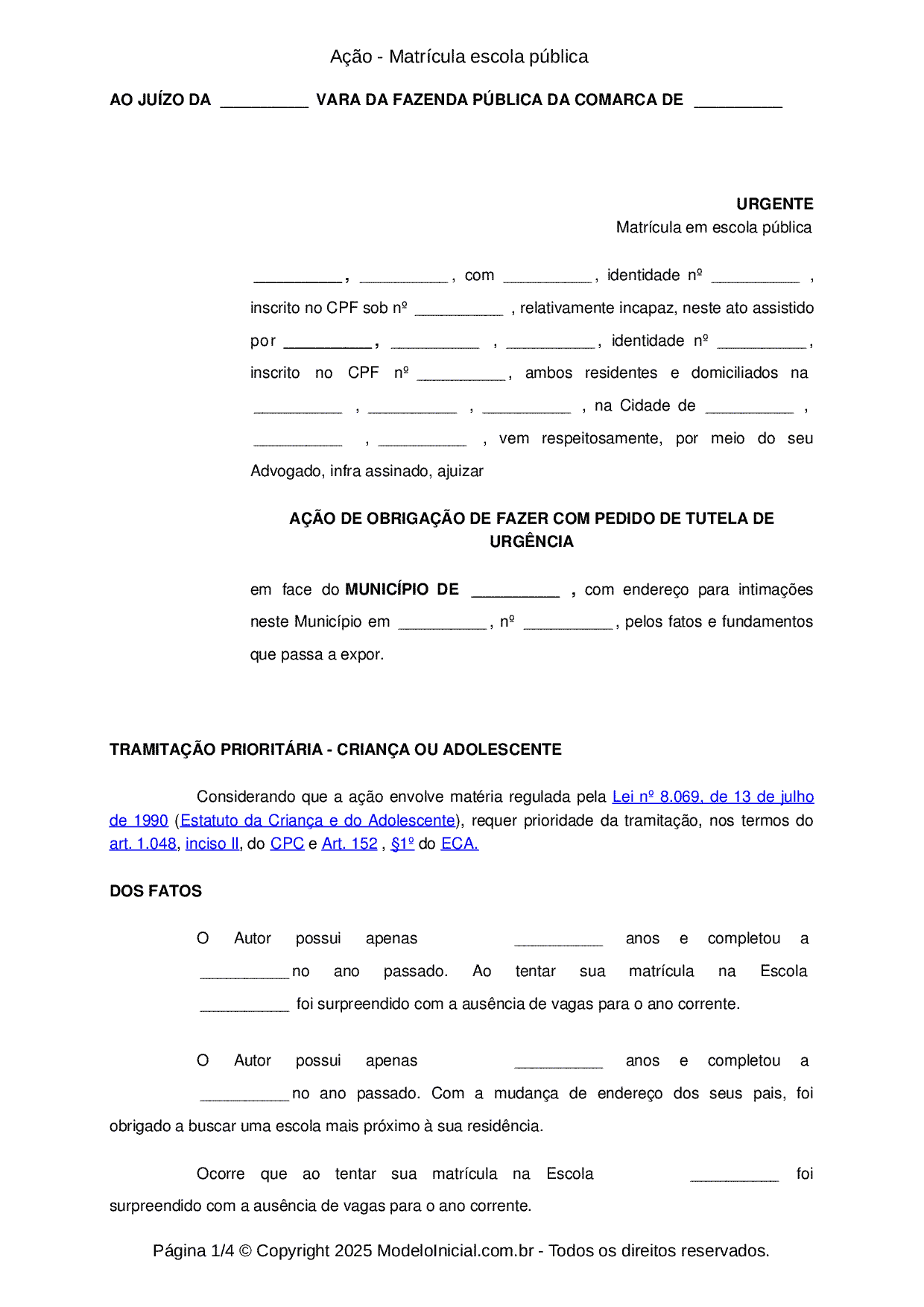 Modelo Acao De Obrigacao De Fazer Matricula Escola Publica