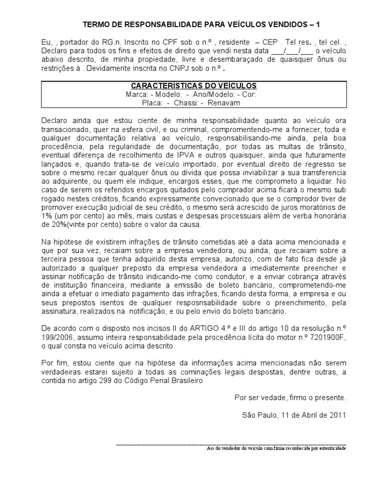 Termo De Responsabilidade Para Veiculos Vendidos Ii