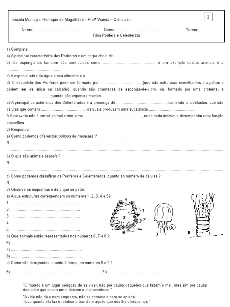 Tarefa Porifera E Celenterata Esponja Natureza