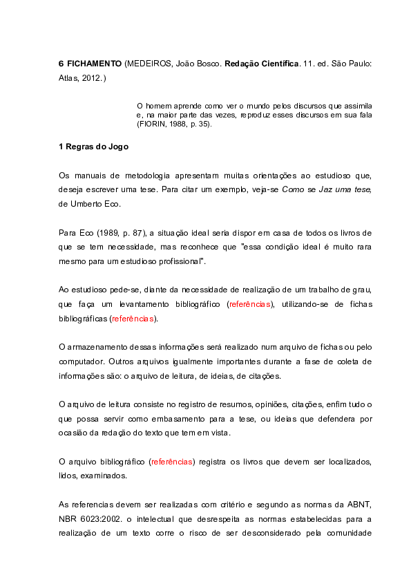 Caro aluno tenho a satisfao de apresentar lhes um modelo de fichamento que poder ser adotado por vocs tanto na ntegra quanto adaptado suas necessidades bem como servir de estmulo para que elaborem outro totalmente diferente desde que se prove til.