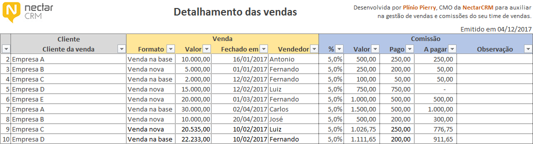 Através da planilha é possível registrar todos os produtos vendidos os clientes compradores os vendedores responsáveis por cada negócio.