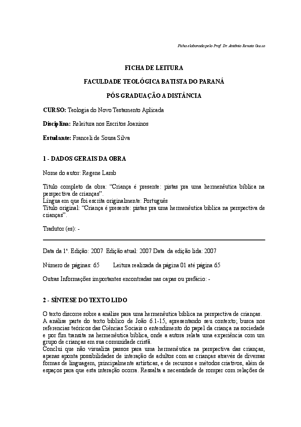 Doc Ficha Elaborada Pelo Prof Ficha De Leitura Faculdade
