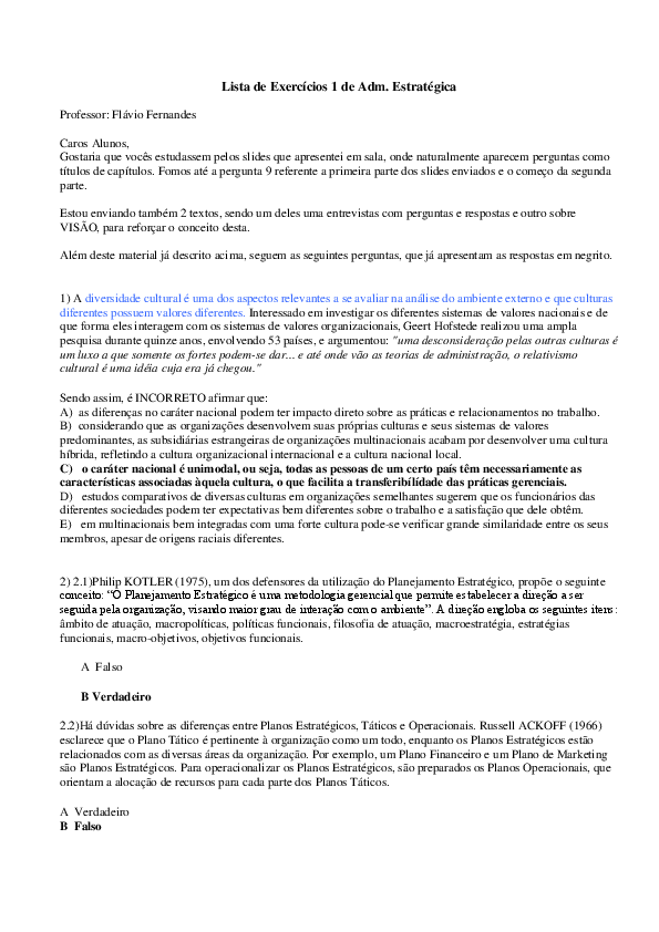 Doc Lista De Exercicios 1 De Adm Estrat Vinolhas Vinolhas
