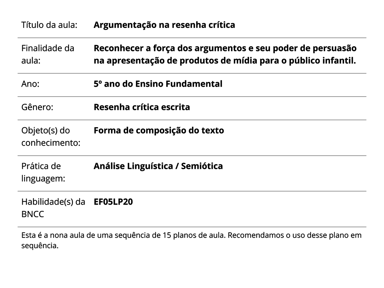 Plano De Aula 5º Ano Lingua Portuguesa Resenha Critica