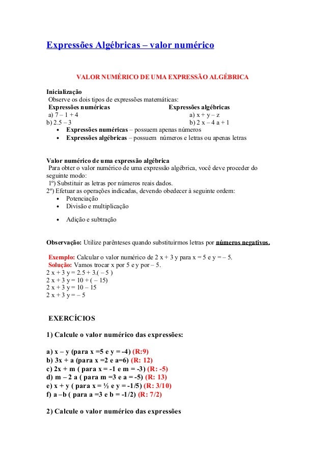Para Calcular O Valor Numerico De Uma Expressao Algebrica