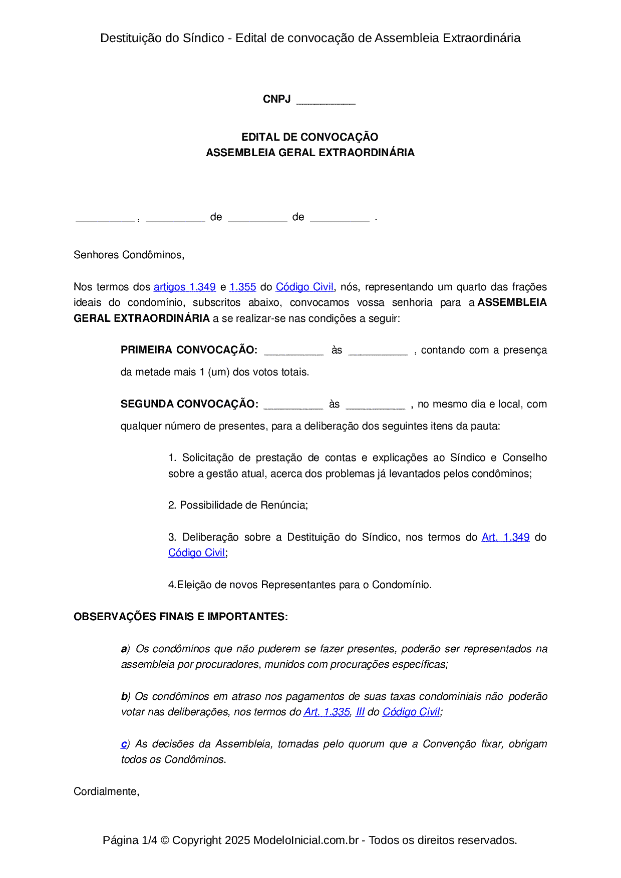 Modelo Destituicao Do Sindico Edital De Convocacao De Assembleia