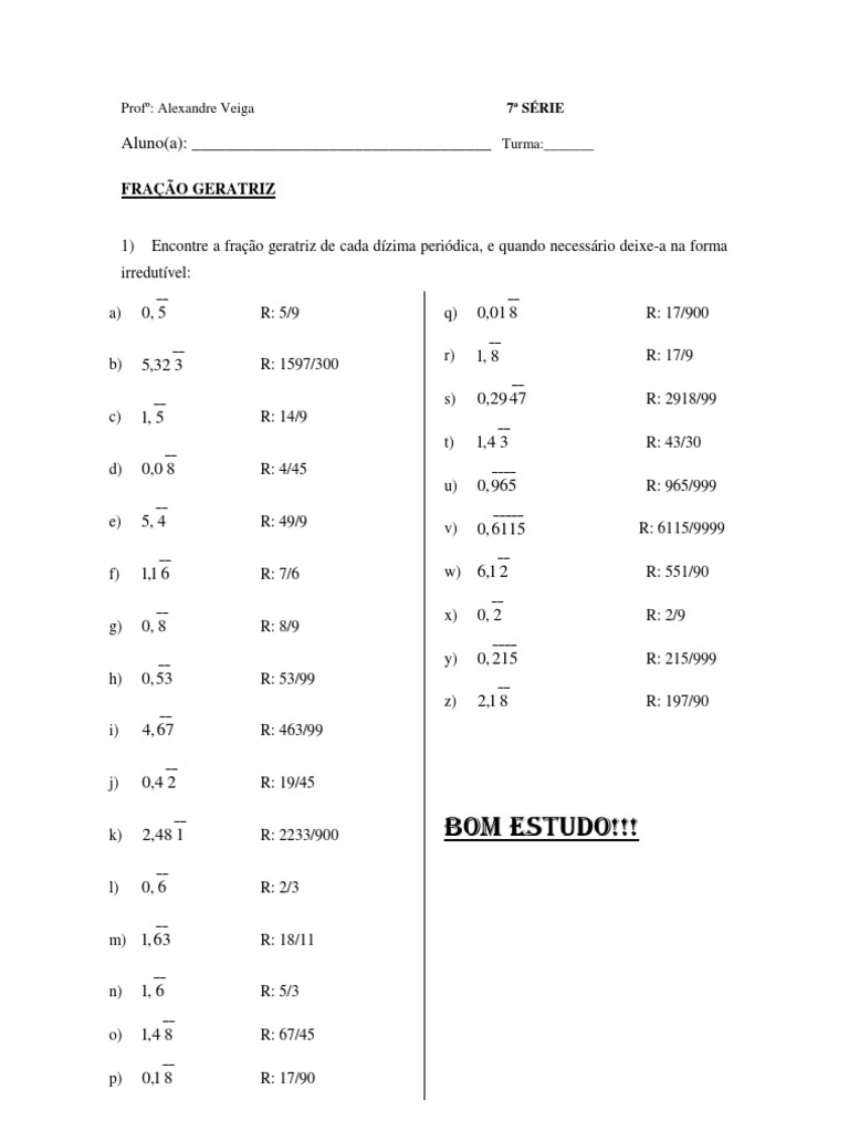 Usando A Regra Pratica Determine A Fracao Geratriz Das Dizimas