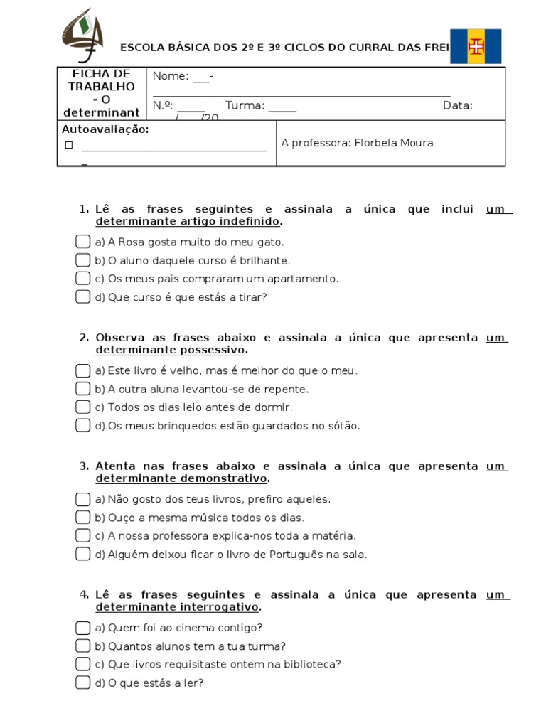 Ficha De Trabalho O Determinante E O Pronome 6ºano 1 Periodo