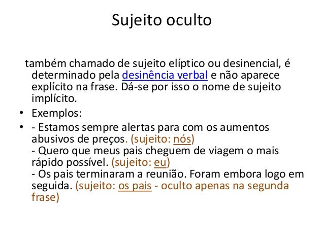 Também designado de sujeito elíptico sujeito implícito e sujeito subentendido o sujeito ocultodesinencial é aquele que não aparece na frase de forma explícita.