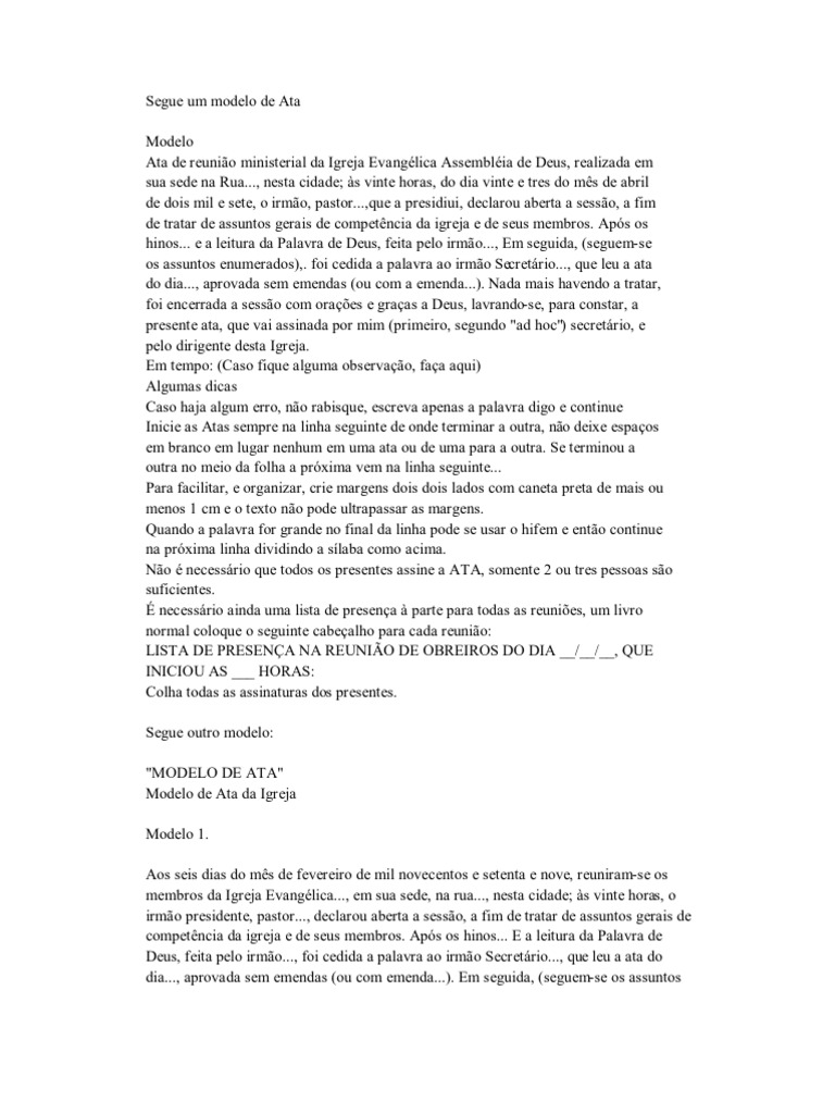 Exemplo De Ata De Reuniao De Igreja Varios Exemplos